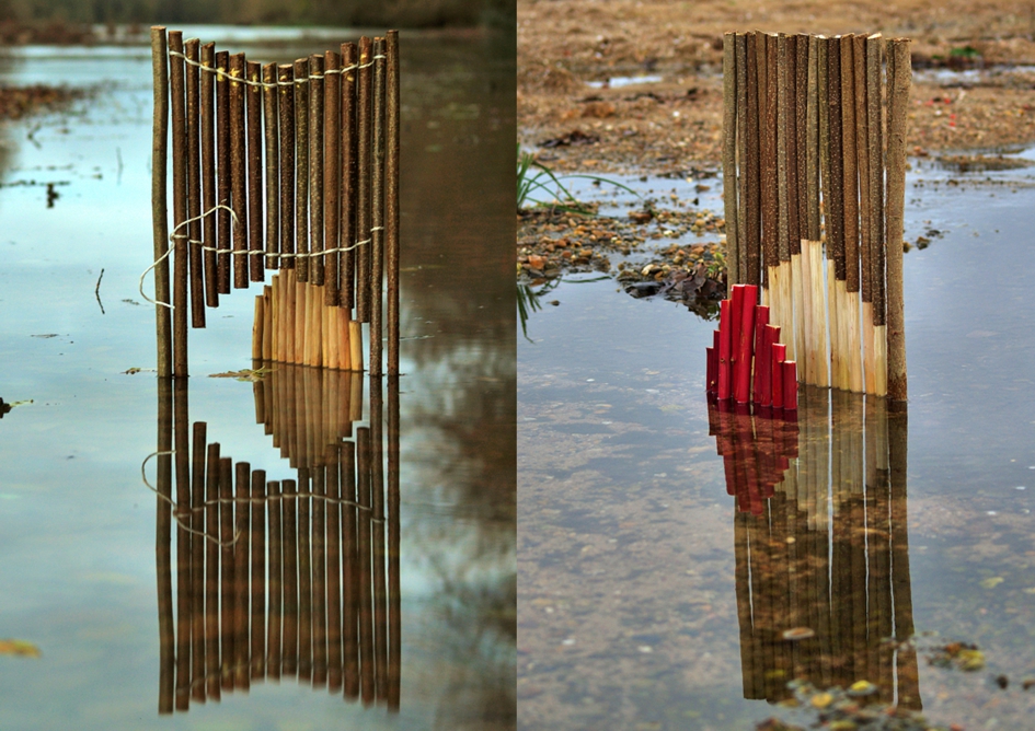 γεωμετρικά σχήματα από κλαδιά και άλλα πράγματα που βρίσκει κοντά στο νερό. Καταργώντας